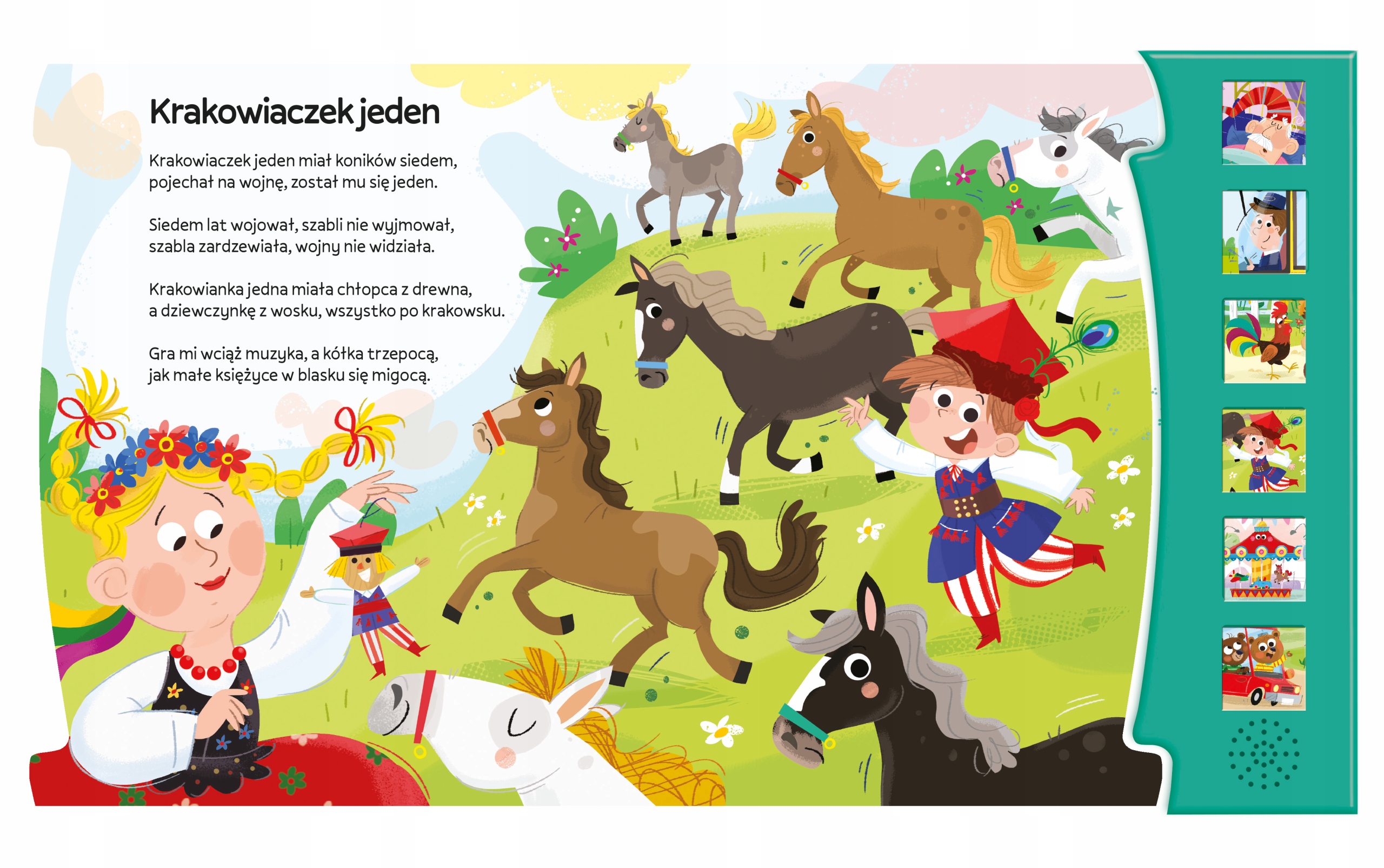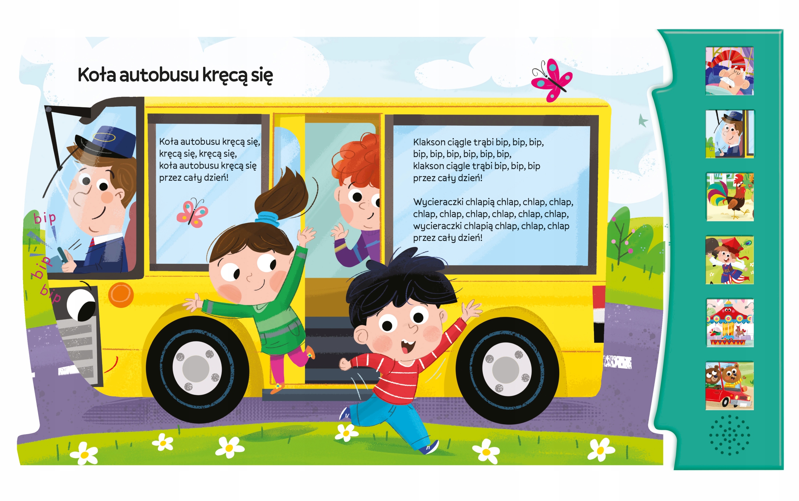 Książeczka kartonowa z PANELEM DŹWIĘKOWYM!W środku teksty znanych i lubianych przez dzieci PIOSENEK.Książka wprowadza w RADOSNY NATRÓJ.