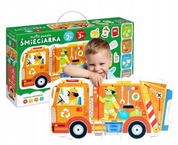 Moto puzzle Śmieciarka to wyjątkowy zestaw edukacyjny dla ciekawych świata odkrywców. W prezentowym pudełku znajdziecie duży puzzlowy wóz składający się z 26 elementów i dodatkowe obrazki do dokładania: 5 kontenerów i 15 śmieci. Wspaniała śmieciarka i ciekawa tematyka inspiruje do mnóstwa kreatywnych zabaw i pozwala na wesoło poznawać zasady segregacji śmieci i ekologii.